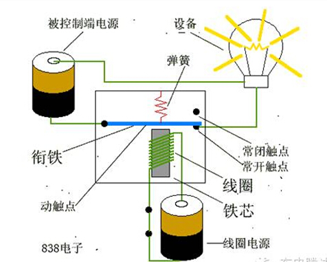 從上圖可以看出,繼電器一般由鐵芯、線圈、銜鐵、觸點簧片等組成的。接通電源后,會產生電磁效應,電磁力就會吸引銜鐵,讓它接觸到鐵芯,帶動銜鐵的常閉觸點與常開觸點吸合,在電流切斷后,電磁的吸力也就沒有了,銜鐵就又返回到原來的位置,將電路切斷。