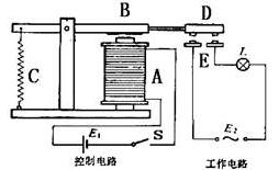 電磁繼電器的構造:如圖所示,a是電磁鐵,b是銜鐵,c是彈簧,d是動觸點,e是靜觸點。電磁繼電器工作電路可分為低壓控制電路和高壓工作電路組成??刂齐娐肥怯呻姶盆Fa、銜鐵b、低壓電源e1和開關組成;工作電路是由小燈泡l、電源e2和相當于開關的靜觸點、動觸點組成。連接好工作電路,在常態時,d、e間未連通,工作電路斷開。用手指將動觸點壓下,則d、e間因動觸點與靜觸點接觸而將工作電路接通,小燈泡l發光。閉合開關s,銜鐵被電磁鐵吸下來,動觸點同時與兩個靜觸點接觸,使d、e間連通。這時彈簧被拉長,觀察到工作電路被接通,小燈泡l發光。斷開開關s,電磁鐵失去磁性,對銜鐵無吸引力。銜鐵在彈簧的拉力作用下回到原來的位置,動觸點與靜觸點分開,工作電路被切斷,小燈泡l不發光。