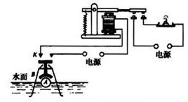 防訊報警器:k是接觸開關,b是一個漏斗形的竹片圓筒,里面有個浮子a,水位上漲超過警戒線時,浮子a上升,使控制電路接通,電磁鐵吸下銜鐵,于是報警器指示燈電路接通,燈亮報警。