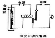 溫度自動報警器:當溫度升高到一定值時,水銀溫度計中水銀面上升到金屬絲處,水銀是導體。因此將電磁鐵電路接通,電磁鐵吸引彈簧片,使電鈴電路閉合,電鈴響報警,當溫度下降后,水銀面離開金屬絲,電磁鐵電路斷開,彈簧片回原狀,電鈴電路斷開,電鈴不再發聲。